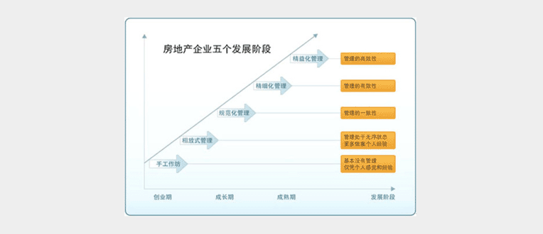 房地產(chǎn)企業(yè)在發(fā)展過程中將經(jīng)歷手工作坊、粗放式管理、規(guī)范化管理、精細(xì)化管理和精益化管理五個(gè)階段。