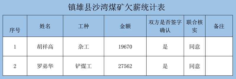 根據(jù)《鎮(zhèn)雄縣2020年直接關(guān)閉退出煤礦獎補資金使用方案》(鎮(zhèn)煤整治辦〔2021〕4號)精神,經(jīng)鎮(zhèn)雄縣人社局、鎮(zhèn)雄縣能源局對11對關(guān)閉退出煤礦的農(nóng)民工工資和工傷賠付進行了清理,現(xiàn)將清理結(jié)果公示如下: