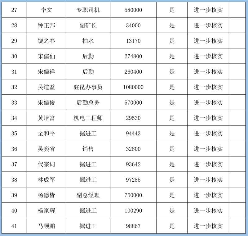 4、復(fù)核組意見:①煤礦管理方新提交的5份5人627萬元欠薪資料因證據(jù)不足暫緩確認;②羅克雄1415434元雖然提供的證據(jù)充足,但由于他是公司的總經(jīng)理且金額較大,需要再次確認;③其他40條欠薪證據(jù)屬實,涉及40人2534935元可以確認。