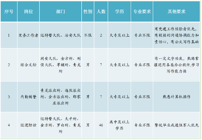 2.優(yōu)先招聘退役士官士兵、見(jiàn)義勇為積極分子和先進(jìn)個(gè)人、政法類(lèi)和警察類(lèi)院校畢業(yè)生;